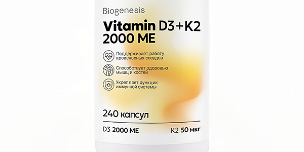 Эта комплексная пищевая добавка создана для дополнительного обогащения рациона витаминами D3 и K2 — ключевыми элементами, которые поддерживают здоровье костей, иммунной системы и сердечно-сосудистой системы.