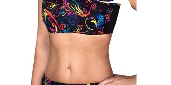 Передние детали лифа и плавок выполнены из принта в стиле "Перо Жар-птицы", с узорами в сине-желто-фиолетовой гамме. Черные плавки.